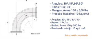 Curvas em borracha natural, resistente a abrasão. Flangeamento. Norma ANSI B16.5, classe 150 ou 300 libras
